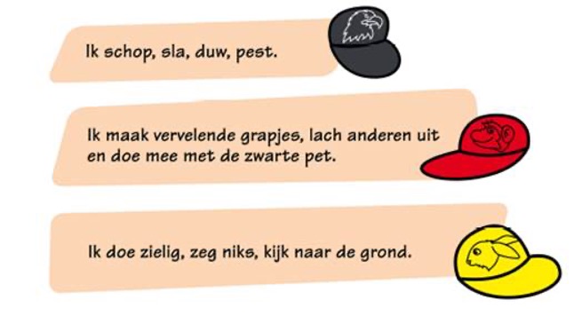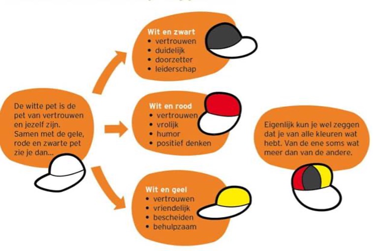 Om in gesprek te gaan over gedrag maken we vanuit de Kanjertraining gebruik van petjes met vier verschillende kleuren. Wanneer zich een probleem of stressvolle situatie voordoet hebben we een keuze om verschillend te reageren. We maken kinderen bewust van hun gedrag en oefenen met nieuw gedrag. Kinderen kunnen zo leren kiezen voor gedrag dat bij hen past en dat prettig is voor henzelf en de ander. Een kind ís niet de kleur van het petje, maar laat gedrag zien dat bij deze kleur hoort.