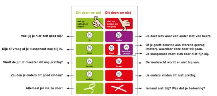 Welk gedrag willen we wel en niet op school? Waar ligt de grens? De smileyposter geeft hier handvatten voor. Wij willen kinderen leren om rekening met elkaar te houden. Let dus een beetje op de gevoelens van de mensen om je heen. Check even of de ander zich nog goed voelt bij jouw gedrag. Andersom geldt ook: het is jouw verantwoordelijkheid om aan te geven wanneer je je ergens niet prettig bij voelt. De meeste mensen bedoelen het goed, maar het gaat wel eens mis. Je helpt de ander door je grens aan te geven: “Ik vind het vervelend als je … doet. Wil je dat anders doen?”